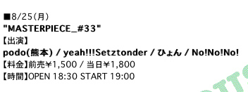 2008.08.25 (月) 黒崎マーカス [MASTERPIECE_#33] 出演 ・podo ・yeah!!!Setztonder ・ひょん ・No!No!No! open 18:30 / start 19:00 前売¥1500/当日¥1800 (ドリンク代別¥500) チケット予約は podo@podo.cc へメール。 http://www.podo.cc/