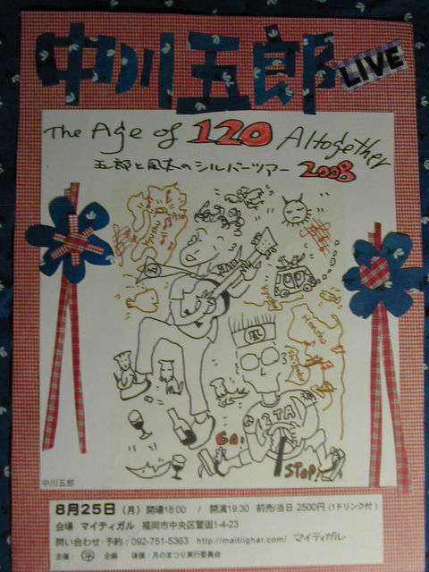 ◆◇◆◇◆ 中川五郎 LIVE ◆◇◆◇◆ Age of 120 Altogther ~五郎と風太のシルバーツアー2008〜 6時open 7時半start 2500円(1ドリンク付き) 中川五郎 http://www.goronakagawa.com/ 1949年大阪生まれ。 68年に「受験生のブルース」や「主婦のブルース」を発表。 70年代に入ってからは音楽に関する文章や歌詞の対訳などが活動の中心に。 90年代に入ってからは小説の執筆やチャールズ・ブコウスキーの小説など さまざまな翻訳も行っている。アルバムに『終わり・始まる』(1969年、URC) 『25年目のおっぱい』(