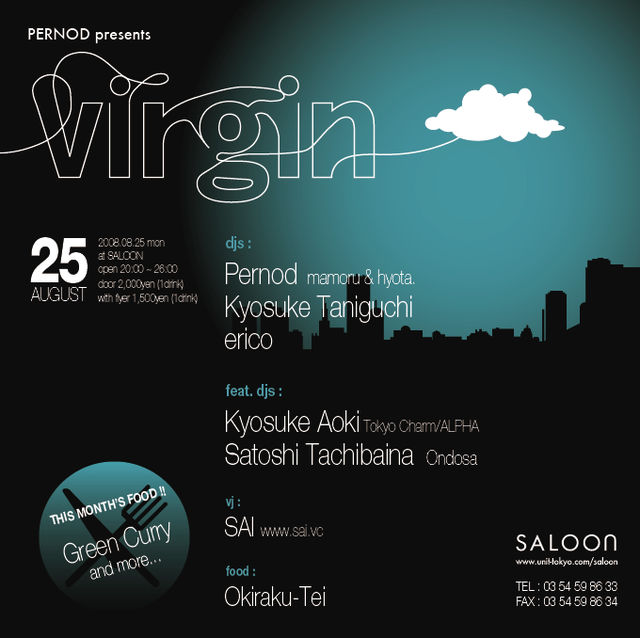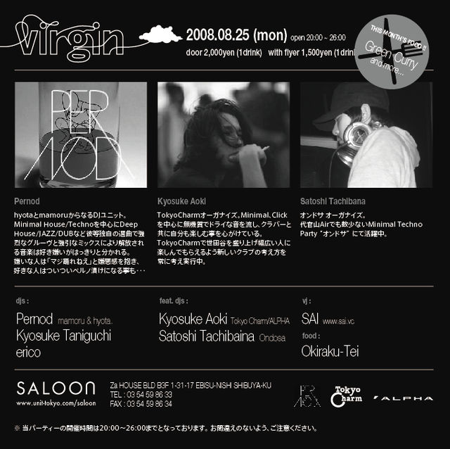 2008.08.25 mon virgin at SALOON DJs PERNOD / Kyosuke Taniguchi / erico Feat.DJs Kyosuke Aoki [Tokyo Charm / ALPHA] Satoshi Tachibana [Ondosa] VJ SAI FOOD Okiraku-tei Menu : グリーンカレー / 野菜スティック and more ★PERNOD hyotaとmamoruからなるDJユニット。 Minimal House/Technoを中心にDeep House/JAZZ/DUBなど 彼等独自の選曲で強烈なグルーヴと強引なミックスにより解放 される音楽は好き嫌いがはっきりと分かれる。 嫌いな人は「マジ踊れねえ」と嫌悪感を抱き、また好きな人はつい つ