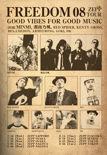 FREEDOM 08 東京都 @ZEPP TOKYO 東京都江東区青海1丁目パレットタウン TEL:03-3599-0710 OPEN 18:00 ARTIST: MINMI 湘南乃風 RED SPIDER KENTY GROSS BES GOKI info:ホットスタッフ 03-5720-9999