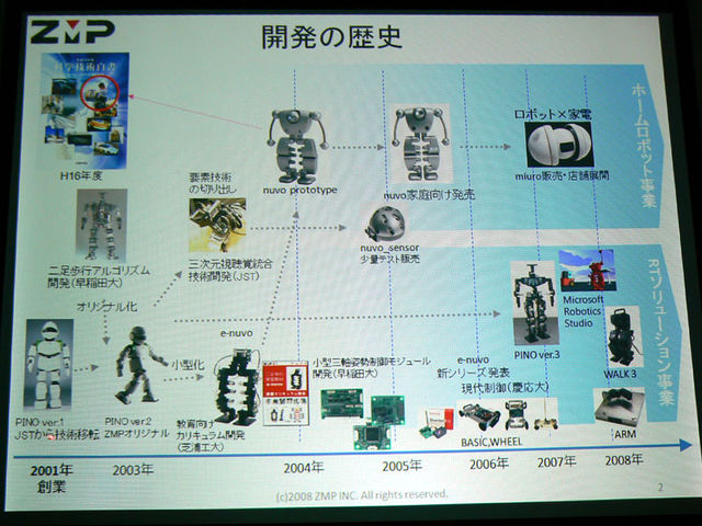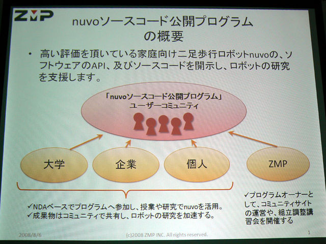 #管理人様には事前に連絡を差し上げた上で投稿していますが、宣伝目的になりますのでご不快な方がおられたら申し訳ありません。 ご意見等お寄せください。 株式会社ゼットエムピー(東京都目黒区、http://www.zmp.co.jp/)の神田と申します。弊社は、Pino、nuvoなどのヒューマノイドロボット、自律ミュージックプレーヤーmiuro、また大学や高専向けの工学教材e-nuvo等を開発・販売しております。 去る8月6日、家庭向け二足歩行ロボットnuvoのソースコードを公開し、本体に加え、組み立てから調整までの講習等をパッケージにした、体験型二
