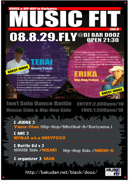 こくつぅ すぅづぅりぇ〜いだすぅますぅ 8/29(金) 『MUSIC FIT vol.4』 1on1 Solo Battle "HOUSE & Hip-Hop"in 郡山 今回のバトルはハウスとヒップホップを別々に行います バトルエントリー \2000/1d 一般 \1500/1d バトルエントリーは当日まで可能ですどうぞよろしく @DJ BAR DOOZ 21:30〜 http://mixi.jp/view_community.pl?id=883684 ----------------------------------------------------------------- 【Guest Judge】Terai(House/Tokyo) ダンスチーム-至芸のメンバーとして
