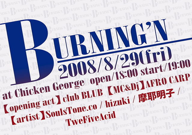 BURNING' N artist club BLUB / hizuki / 摩耶明子 / SoulsTone.co / TweFiveAcid MC&Dj AFRO CARP 公演日 2008年8月29日(金) 開場/開演 18:00/19:00 前売料金/当日料金 \2,000/\2,500(ドリンク代\500別途)