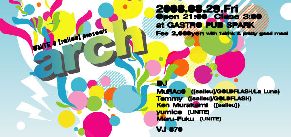 管理人様,告知失礼いたします. 先週土曜日はお世話になりました.DJのMaru-Fukuです♪ 今週金曜日,クラブイベントを行います! ぜひ遊びに来てください!! ----- UNITE&[sailou] presents 「arch」 2008/08/29 (金) 21:00〜next 3:00 @GASTRO PUB SPARK 〒651-0097 神戸市中央区布引町3-2-1 公団布引ビル1F TEL / 078-242-7805 \2,000- with 1drink and the pretty good meal DJs MuRAc0 ([sailou]/GOLDFLASH/La Luna) Tommy ([sailou]/GOLDFLASH) Ken Murakami ([sailou]) yumico (UNITE) Maru-Fuku (UN
