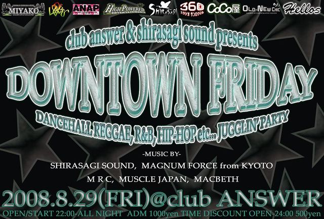 管理人様告知お願いします -club answer&shirasagi sound presents- ■DOWNTOWN FRIDAY■ vol,3 2008,8,29[fri] @club ANSWER OPEN/START 22:00-ALL NIGHT ADM;\1500[with 1D] TIME DISCOUNT;OPEN-24:00 \1000[with 1D] -MUSIC BY- SHIRASAGI SOUND MAGNUM FORCE from KYOTO M,R,C MUSCLE JAPAN MACBETH INFO...shirasagi_sound@yahoo.co.jp