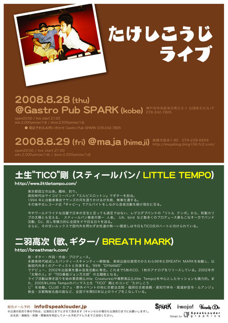 ◆08年8月29日(金) LIVE:たけしこうじ http://mixi.jp/view_community.pl?id=3134329 ○土生"TICO"剛(スティールパン/little rempo) http://www.littletempo.com/ http://mixi.jp/view_community.pl?id=11121 ○二羽高次(歌、ギター) http://breathmark.com/ http://mixi.jp/view_community.pl?id=32614 DJオオカマカズユキ open19:00 / live start 20:00 adv.2,500yen(w/1d) / door.3,000yen(w/1d)
