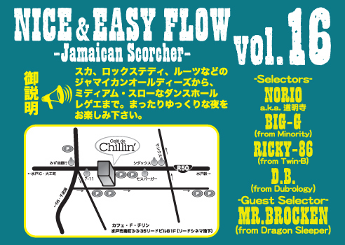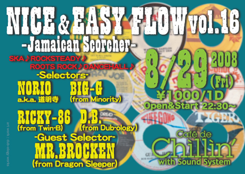 ◆NICE & EASY FLOW◆16 Jamaican Scorcher [Guest Selector] MR.BROCKEN (from Dragon Sleeper) [Selector] NORIO(from道明寺) BIG-G(from Minority) RICKY-86(from Twin-B) D.B.(from Dub-ology) 8/29(金) cafe de Chillin'@水戸 START/22:30 Adm: ¥1000/1D