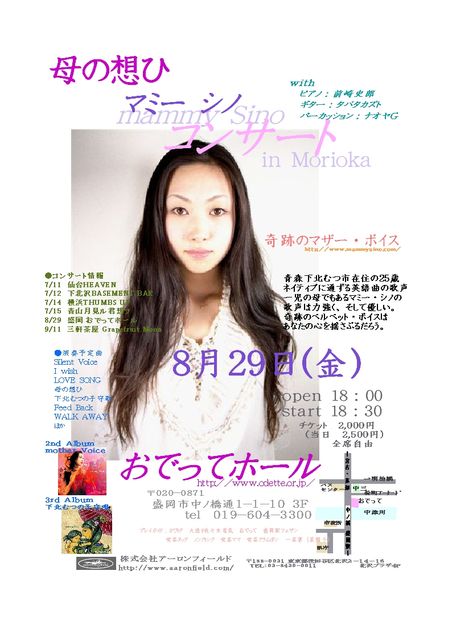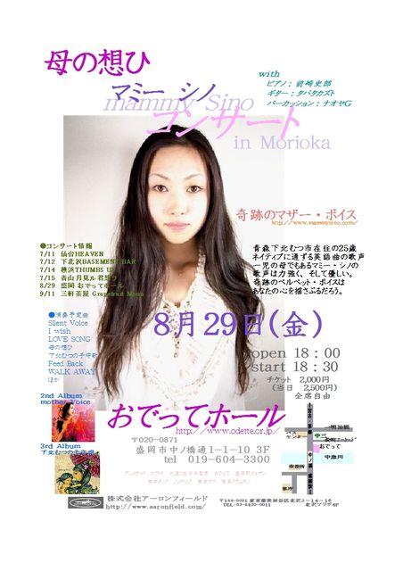 おでってでコンサートがあります。 癒し系の実力派シンガーの マミーシノさんという方です。 青森むつ市在住25歳のママさん。 どうかよろしくお願いします。 ●8月29日(金) 盛岡 おでってホール ■open/18:00 start/19:00 ■前売 \2,000 当日¥2,500 オフィシャルサイト http://www.mammysino.com/