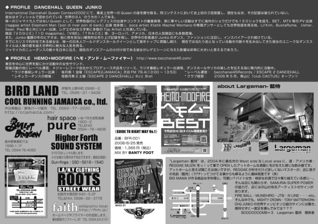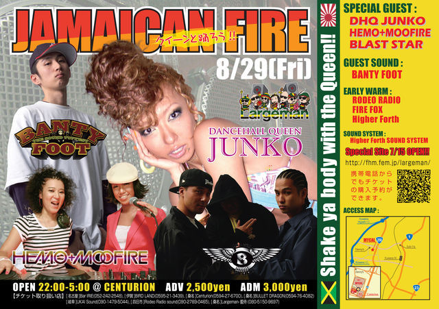 今回も間違い無いアーティスト勢で会場はマショップ確実でしょう JAMAICAN FIRE Vo.2 『クイーンと踊ろう♪』 2008年8月29日(金) マイカル桑名@CENTURION 23:00pm〜5:00am 前売り 2500円 当日 3000円 ≪SPECIAL GUEST≫ DHQ JUNKO HEMO+MOOFIRE BLAST STAR ≪GUEST≫ BANTY FOOT ≪EARLY WARM≫ RODEO RADIO FIRE FOX HIGHER FORTH ≪SOUND SYSTEM≫ HIGHER FORTH SOUND SYSTEM チケット取扱い店 ☆Bar IRIE 052-242-2548 ★BIRD LAND 0595-21-3439 ★RODEO RADIO 090-27