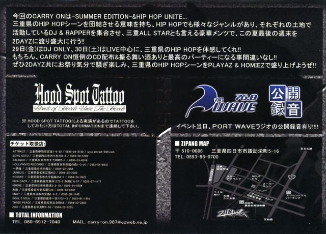 今回のCARRY ONは-SUMMER EDITION-&-HIP HOP UNITE- 三重県のHIP HOPシーンを団結させる意味を持ち、HIP HOPでも様々なジャンルがあり、それぞれの土地で活動しているDJ & RAPPERを集合させ、三重ALLSTAとも言える豪華メンツで、この夏最後の週末を2DAYZに渡り盛大に行います 29日(金曜)はDJ ONLY、30日(土曜)はLIVE中心に、三重県のHIP HOPを体感して下さい もちろん、CARRY ON好例のCD配布&テキーラ振る舞いと最高のパーティーになる事間違いなし そして、HOOD SPOT TATTOOによる実演がありますのでチェキ