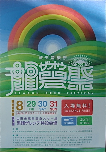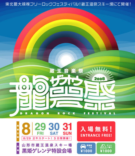 (mixi 蔵王龍岩祭2008 コミュニティ) http://mixi.jp/view_community.pl?id=859521 (蔵王龍岩祭2008 ウェブサイトより) http://zaoryugansai.com/ 蔵王音楽祭 蔵王龍岩祭2008 2008 8/29(金) 30(土) 31(日) 正午〜3日間開催! 場 所 山形県山形市蔵王温泉 黒姫ゲレンデ特設会場 (地図) (★今年は会場が変わります!) 入場料:無料 駐車協力金:1回の入退場につき1000円 キャンプ:三日間で1000円 温泉街への宿泊:一泊3500円〜(蔵王温泉観光協会へお問い合わせください) シャトルバス