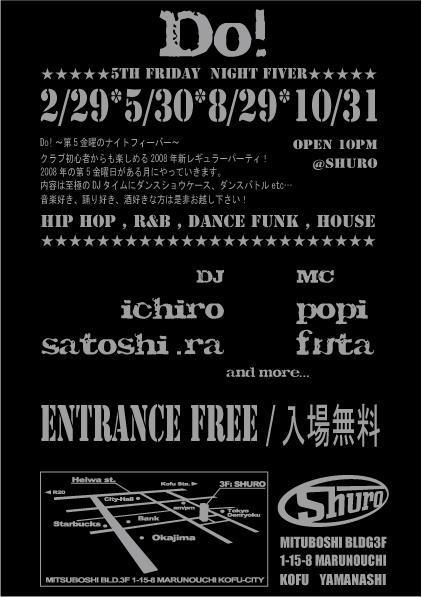 管理人様、告知失礼します。 クラブイベント「Do!」の告知です。 8/29(金) 場所は甲府SHURO 22:00〜27:00 なんと入場無料です!ふるまい酒もあります! DJ ichiro, satoshi.ra, sakura HIPHOP, R&B, DANCE FUNK, HOUSE 司会 フウタ ダンスショーケース 北口扇風機 DOEK アッパーライズ Dear ダンスバトル メッツマンVSボクシ クラブシュロの住所は甲府市丸の内1−15−8 三ツ星ビル3階です。 旧パセオ前の細い路地に入り口があります。 入り口にはMBって書かれた看板が