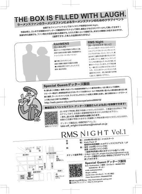 RMSが前回よりもパワーUPして帰ってきました!今回は前回好評だったコントライブやmagic showに加え、音楽ライブ、店内装飾、そしてスペシャルゲストにゲッターズ飯田さんを迎えイベント中に占いを体験できるスペシャル企画などを盛り込み、さらに濃い内容になってRMS nightを盛り上げてくれます。