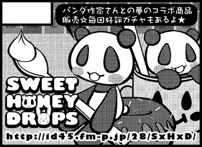 創作スペース『SWEET HONEY DROPS』 E-31・32 -・-・-・-・-・-・-・-・-・-・ スペースは出入口寄りの真ん中らへん。 なので今月はガチャは置きませんorz 代わりに新作カットのでっかいポップを置けたらと思ってマス。 -・-・-・-・-・-・-・-・-・-・ ☆新作販売予定商品リスト☆ ◇ケース付シールセット ○カードケース(ぴんく/みずいろ/おれんじ) ○定期入れ(ブラック) ○トート(A4サイズエコタイプ/ナイロンタイプ) ○ミニポーチ ○携帯ケース ○ストラップ ○ステッカー ○バッジ ○ポストカード ◇…