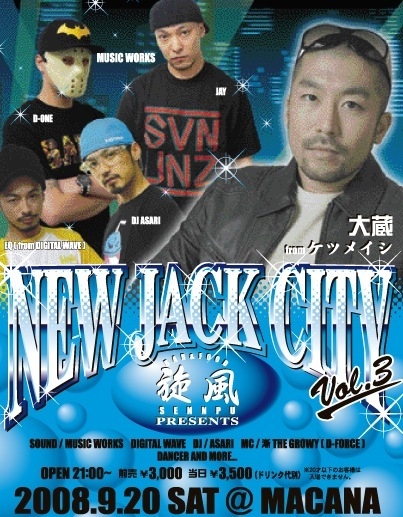 管理人様告知失礼いたします。 NEW JACK CITY VOL.3 9月20日(土) @MACANA(仙台) OPEN PM9:00~ AM5:00 前売り:3000円(ドリンク別) GUEST/大蔵(ケツメイシ),KEIN SOUNDS/MUSIC WORKS,DIGITAL WAVE DJ/ASARI ご興味ある方はメッセージください!