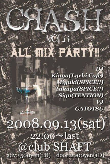 告知失礼します。 今週土曜日です!!!!! 『CRASH』 Vol.6 2008・9・13(sat)    22:00〜LAST ALL MIX PARTY    @CLUB SHAFT ADV. ¥1500(1D) DOOR.¥2000(1D) DJ   KINYA (LYCHI CAFE)      MIYUKI(SPICE!!)      TAKUYA(SPICE!!)      SIGN  (TENTION) VJ   GATOTSU R&B HOUSE TRANCE DAN