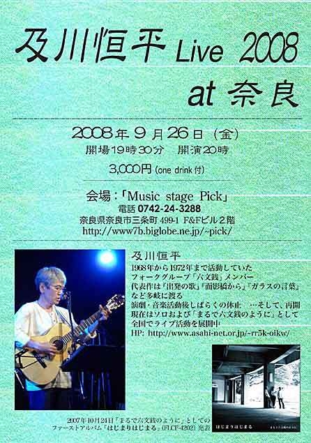 及川恒平さん(元六文銭、代表曲「面影橋から」、「雨が空から降れば」等)のライブ告知させて頂きます。 ちなみに、今回の奈良ー京都ー大阪・・・どこの会場をとっても オーナーは全く別の濃い・・・キャラをもたれてます。 百聞は一見にしかずですが。(って、アーティストの宣伝をしてませんが、 ライブハウスにも個性がありますので、宜しくお願い致します。) (1) 奈良 日時:2008年9月26日(金) 時間:開場19:30 開演20:00 会場:「Music stage Pick」 奈良県奈良市三条町