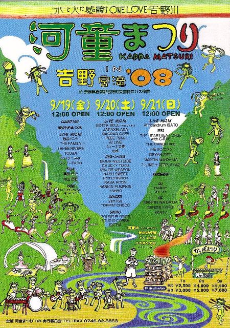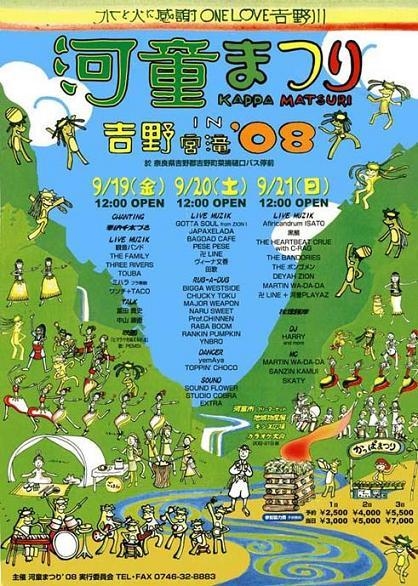 水と火に感謝 ONE LOVE 吉野川 河童まつり’08 in 吉野宮滝 奈良県吉野郡吉野町菜摘樋口バス停前 9月19日(金)20(土)21(日) 1日 予約¥2500 当日¥3000 2日 予約¥4000 当日¥5000 3日 予約¥5500 当日¥7000 9/19(金)12:00〜 ーCHANTINGー 奉納千本づき ーLIVEー 観音バンド THE FAMILY THREE RIVERS TOUBA ミハラ(フラ奉納) ワンチ+TACO TAKEZOOO(奉納炎舞) −TALK− 富田貴史