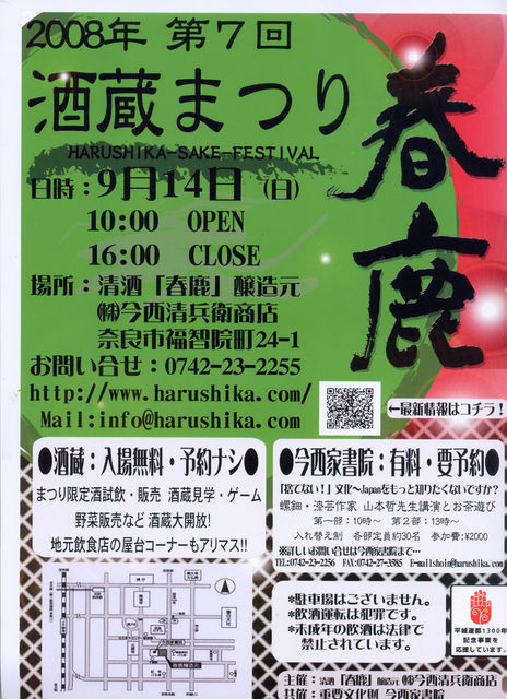 春鹿 酒蔵まつり2008 毎年恒例の人気のイベントです。 日時:平成20年9月14日(日)10:00〜16:00 場所:「春鹿」醸造元 今西清兵衛商店 駐車場スペースはありませんので、車でのご来場はご遠慮ください。 入場料無料 1、酒蔵まつり2008限定酒の発売! 限定酒の無料試飲ができます! 一富士二鷹三茄子 (大吟醸年数さらに酵母違い3種セット) 吟春・吟純・吟本 (純米吟醸・純米・本醸3種) 味醂レモン Tea まつり限定リキュール 2、酒蔵工場見学会 酒造り中ではありませんが「