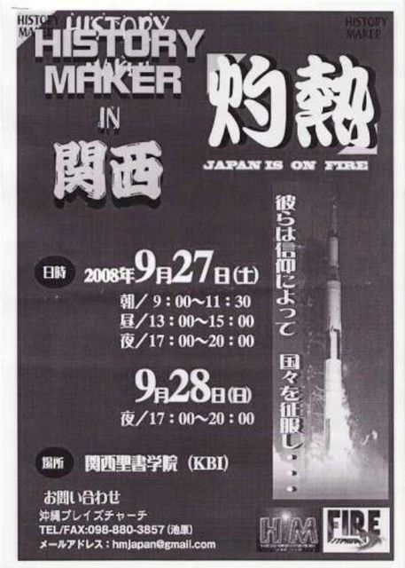 日時:2008年9月27日(土) 朝/9:00〜11:30 (その前に5:30から早天☆) 昼/13:00〜15:00 夜/17:00〜20:00 9月28日(日) 夜/17:00〜20:00 場所:関西聖書学院(KBI) http://www.kbiwave.com/top.html 講師:リチャード・ウィリアム師 アジアの情熱と一つになる! 時代を超えて新たな歴史が始まる! HISTORY MAKER 日 本の救い! リ バイバルの時!!! 国 を勝ち取る時!!!! このイベントを見たら、 ぜひ ヒストリーメーカーのことをお友達に教えてあげてね。 これ