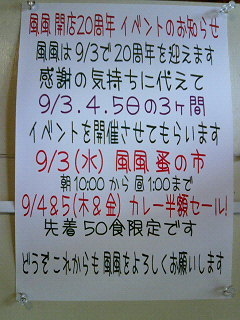 1988年の9月にオープンして20周年を迎えることができました! 感謝の気持ちを込めて 9/3(水)お店全体を使って蚤の市を開催します。 AM10時〜PM1時まで 9/4(木).9/5(金)は限定50食*風風カレー*がなんと半額セール!!(350円) また詳しいことや補足がありましたらお知らせしますね。