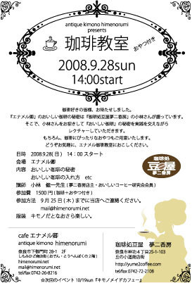 『エナメル卿』から、珈琲教室のご案内。 キモノにはコーヒー!のヒメノルミ 企画です! ---------------------------------------------- 2008.9.28(日)14:00start antique kimono himenorumi presents 『珈琲教室 おやつ付き』 ----------------------------------------------- 珈琲好きの皆様、お待たせしました。 『エナメル卿』 のおいしい珈琲の秘密は、『珈琲処 豆屋夢二香房』 の小林さんが握っています。 そこで、小林さんをお招きして『おいしい珈琲』の秘密を実践を まじえながらレ