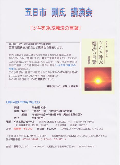 奈良でツキを呼ぶ魔法の言葉の五日市剛さんの講演会を開催します。 五日市剛さん特別講演会 ○日時: 平成20年9月20日(土) 開場 午後2時30分 開演 第1部 午後3時〜5時 ツキを呼ぶ魔法の言葉 第2部 午後5時15分〜6時15分 魔法の言葉の正体 終了 午後6時20分 ○場所:やまと郡山城ホール 奈良県大和郡山市北郡山町211−3 TEL 0743-54-8000 近鉄橿原線 郡山駅 徒歩7分 JR大和路線 郡山駅 徒歩15分