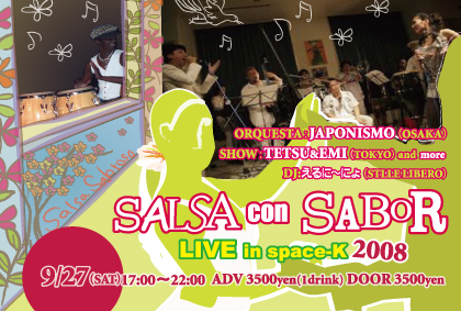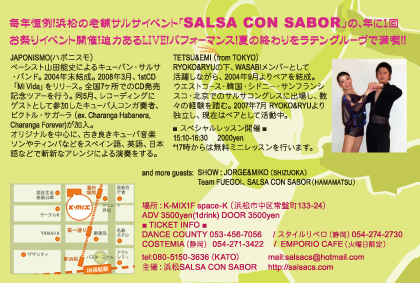 9月の第4土曜日、毎年恒例となりました!! 浜松の老舗サルサイベント「SALSA CON SABOR」の、年に1回お祭りイベント開催! 迫力あるLIVE!パフォーマンス!夏の終わりをラテングルーヴで満喫!! 9月27日(土)17:00〜22:00 場所:K-MIX本社1F space-K(浜松市中区常盤町133-24) LIVE:JAPONISMO(OSAKA) DJ:えるに〜にょ(STLLE LIBERO) SHOW:TETSU&EMI(TOKYO)JORGE&MIKO(SHIZUOKA)SALSA FUEGO、SALSA CON SABOR(HAMAMATSU) CHARGE:前売り¥3500(1drink) 当日¥3500 TETSU&EMIのサルサダンスLESSON:¥2000(15:10〜16:30