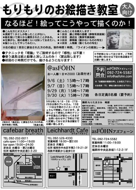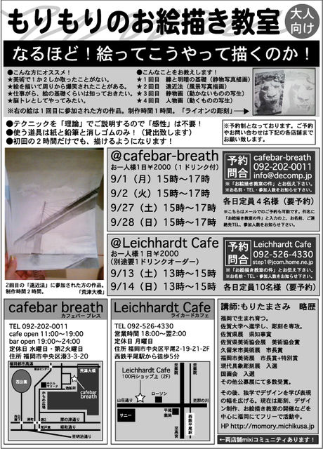 9月に開催しますお絵描き教室の告知です(´∀`)わいわい 店舗とドリンクと時間帯がちょと違います!ご注意を(゚∀゚)! ★★★★★★★★★★★★★★★★★★★★★ @cafebar-breath 定員4名 (要予約) お一人¥2000(1ドリンク付き) 9/1(月)15時〜17時 9/2(火)15時〜17時 9/27(土)15時〜17時 9/28(日)15時〜17時 cafebar breath(カフェバーブレス) TEL:092-202-0011 cafe open:11:00〜19:00 bar open:19:00〜24:00 定休日:水曜日・第2火曜日 住所:福