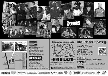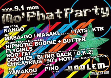 2008.9/1(mon) Mo'PhatParty @ HARLEM ALL DANCE MIX ■GUEST DJ ・DJ KANGO ■DJ ・DJ MASA→GO ・DJ MASAKI(C.R.E.A.M.) ・DJ TATS ・DJ KTR ■SPECIAL DANCE SHOWCASE ・HIPNOTIC BOOGIE + BUTTER ・FLYGIRLS ・BOO' FAT(MACCO(SUNNIN'), ACHI(Rockwilder), AMO(BIG BOOTY), KAORI(B-trust), USK, YO-SKE(BUSH BABEEZ!!)) ・GOONIES ・BLING BACK ・O.K.2! ・CHICA5RIUS ・90's HOT!(DI-VA / DISCO DadZ / SLEaPER) ■HOST ・PINO(ALMA) ■MC ・YAMAKOU(sinario) オシャレな遊び人 パーティーピーポ