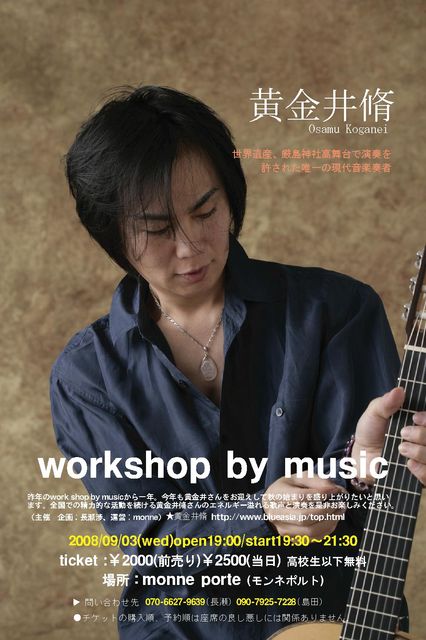 workshop by music 昨年のwork shop by musicから一年。今年も黄金井さんをお迎えして 秋の始まりを盛り上がりたいと思います。 全国での精力的な活動を続ける黄金井脩さんのエネルギー溢れる歌声と 演奏を是非お楽しみください。 (主催・企画:長瀬渉、運営:monne) ★黄金井脩 http://www.blueasia.jp/top.html 2008/09/03(wed)open19:00/start19:30〜21:30 ticket :¥2000(前売り)¥2500(当日) 高校生以下無料 場所:monne porte (モンネポルト) 長崎県東彼杵郡波佐見町井石郷(西の原)