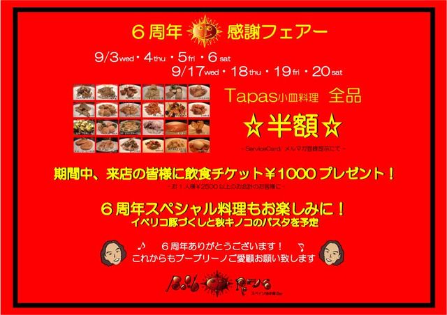 6周年ありがとう!感謝フェアー 9/3wed--6sat・9/17wed--20sat (18:00 - 23:00) 日頃の皆様のおかげを持ちまして、6周年を迎える事が出来ました 本当に感謝!ありがとう!デス 感謝の気持ちを込め6周年感謝フェアーを行います 期間中は Tapas半額 ¥1000チケットプレゼント Mrスペシャル料理 などで皆さんに楽しんで頂きたいと思います 是非ご来店の程、お待ちしています
