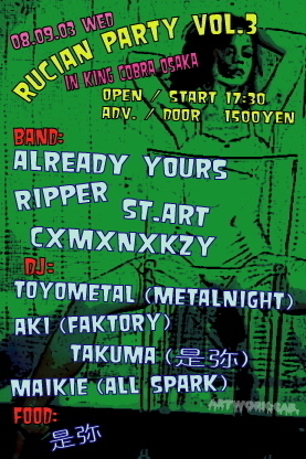 2008.9.3(wed) -ROOM RUCIAN Presents- 『RUCIAN PARTY! vol.2』 @KING COBRA http://king-cobra.net/first.html 大阪市中央区西心斎橋2-18-7-3F Tel & Fax : 06-6211-2875 OPEN/START 17:30 ADV/DOOR 1500yen(+1D) -LIVE- AlReady Yours RIPPER ST.ART CxMxNxKzY -DJ- TOYOMETAL(METAL NIGHT) AKI(FAKTORY) TAKUMA(是弥) MAIKIE(ALL SPARK) -FOOD- 是弥
