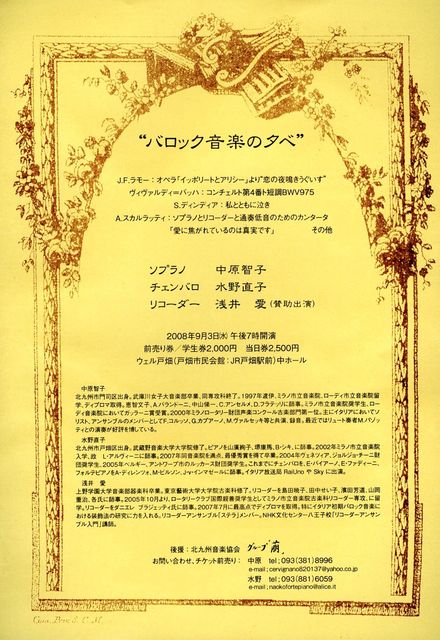 “バロック音楽の夕べ” 北九州出身でヨーロッパで活躍されている音楽家の方が戸畑で演奏会をします。 なかでも、チェンバロの水野さんは戸畑出身のため、お知り合いの方もいらっしゃるかもしれません。 興味のある方は是非お越しください。 「古音楽」といってバロック、ルネッサンス期の音楽のため馴染みが薄いかもしれませんが、美しい旋律です。 ソプラノ :中原智子 チェンバロ:水野直子 リコーダー:浅井 愛(賛助出演) 日時:2008年9月3日 午後7時開演 場所:ウェルとばた中ホール 前売り券/学生券 20