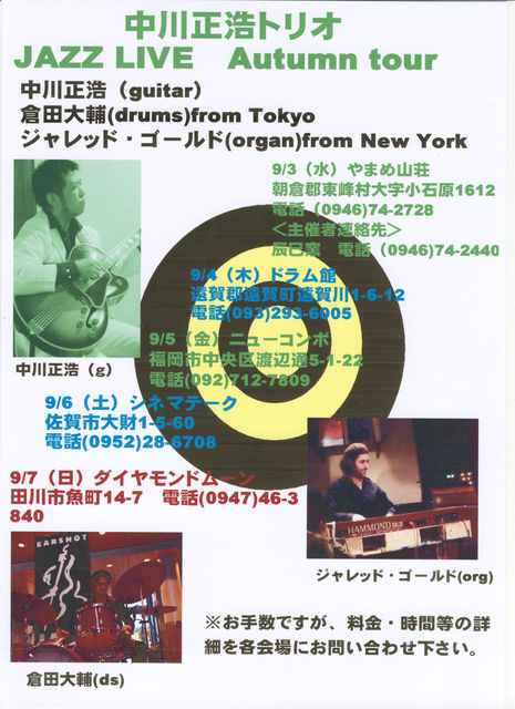 中川正浩トリオ JAZZ LIVE Autumn Tour 中川正浩(guitar) http://bbs.5jigen.jp/sr3_bbss.cgi?cat=92nakagawa 倉田大輔(drums)from Tokyo http://kuratajazz.com/ Jared Gold(organ)from New York ●9/3(水)やまめ山荘 福岡県朝倉郡東峰村大字小石原1612 電話(0946)74−2728 <主催者連絡先> 辰巳窯 電話(0946)74−2440 ●9/4(木)ドラム館 福岡県遠賀郡遠賀町遠賀川1−6−12 電話(093)293−6005 ●9/5(金)ニューコンボ 福岡