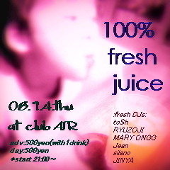 告知失礼します。 Fresh Juice 100% @ Club Air,Kumamoto 9/4(Thu) adv/500yen(with 1drink ticket) day/500yen DJs toSh RYUZOJI MARY ONGG JEAN silano JINYA 500円で統一しましたパーティーです♪ 前売りだとおまけみたいな感じでドリンクチケットついてきます。 当日買っても500円です! 平日開催ですが皆々様是非おこしくださいませm(_ _)m 前売りを購入希望の方はメッセージにて名前と人数をお知らせください。 失礼しました。