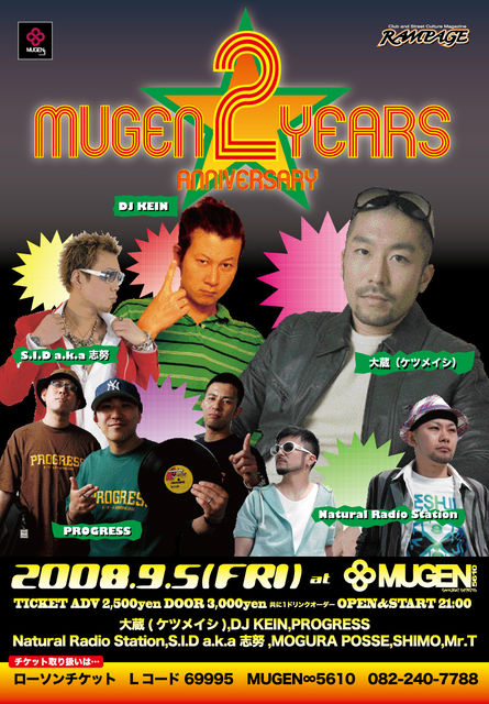 MUGEN5610の2nd Anniversary が開催されるんです!!! しかも、ゲストは超豪華なんです。 まぁ〜みんなでこにゃ〜いけんじゃろ〜的な、お祭りイベント兼MUGENの 2歳の誕生日!!! ぜひっ!!!!! MUGEN 2nd Anniversary 2008/9/5 (fri)@MUGEN5610 OPEN&START:21:00 TICKET ADV:\2500 / DOOR:\3000 ローソンチケット Lコード 69995 infomation: MUGEN5610 082-240-7788 RAMPAGE 082-227-1212 SPECIAL GUEST:大蔵 from ケツメイシ / DJ KEIN GUEST:Natural Radio Station / PROGRESS / SID aka 志努