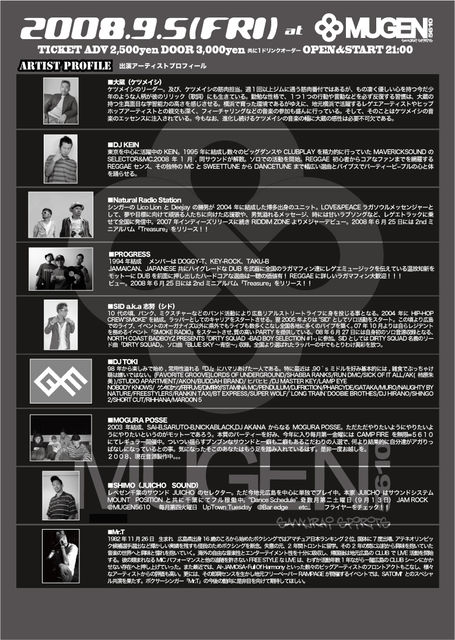 MUGEN 2周年パーティー★第2弾★ おかげさまでMUGENも2周年を迎えることとなりました、第1弾 GALAXY CRUISEに続き第2弾をさせていただきます。これからもどうぞMUGENを宜しくお願いします 2008/09/05 (金) OPEN21:00 ADV2500 DAY3000 共に1ドリンクオーダー チケットインフォメーション ローソンチケット Lコード69995 MUGEN∞5610 082-240-7788 出演アーティーストプロフィール ■大蔵(ケツメイシ)■ ケツメイシにリーダー。及び、筋肉担当。週1回以上ジムに通う筋肉番付ではあるが、ものすご