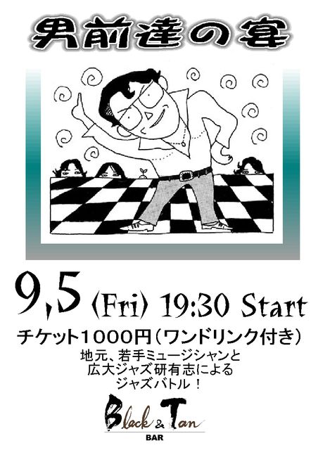 「 男前達の宴 」 黒瀬、呉 西条の若手ミュージシャンによる宴 ジャズを中心にポップス系ジャズアレンジ、などなど・・ 実際、聴いてみてのお楽しみ〜〜 2バンドによる、ライブバトル!!! 「 男前ご一同様 」 Jr (Sax) ひえちゃん(Gt) ちゅう (Gt) えいじろう(Ba) マーシー (Dr) 「 広島大学ジャズ研究会 」 前川 善亮 (Gt) 細川 徹哉 (Ba) 大藤 裕介 (Dr)