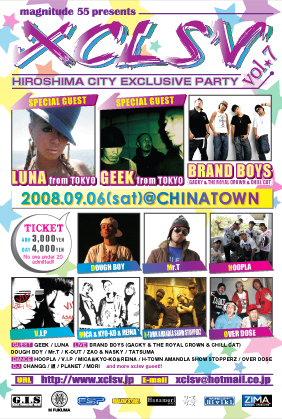 前回600人を動員したあのモンスターパーティーがやってくる!!! magnitude 55 presents 『XCLSV vol.7』 09月06日(土) @CHINATOWN OPEN 22:00 - CLOSE 05:00 ※23:00〜03:00までの間は、再入場につきCHARGE(\500)を頂きますのでご了承ください。 【SPECIAL GUEST】 GEEK(OKI,SEI-1,DJ EDO)(TOKYO) / LUNA(TOKYO) 【LIVE】 THE ROYAL CROWN GACKY DOUGH BOY Mr.T ZAO&NASKY K-OUT CHILL CAT ★TATSUMA 【DANCE】 HOOPLA V.I.P ★MICA&KYO-KO&REINA H-TOWN AMANDLA SHOW STOPPERZ OVER DOSE