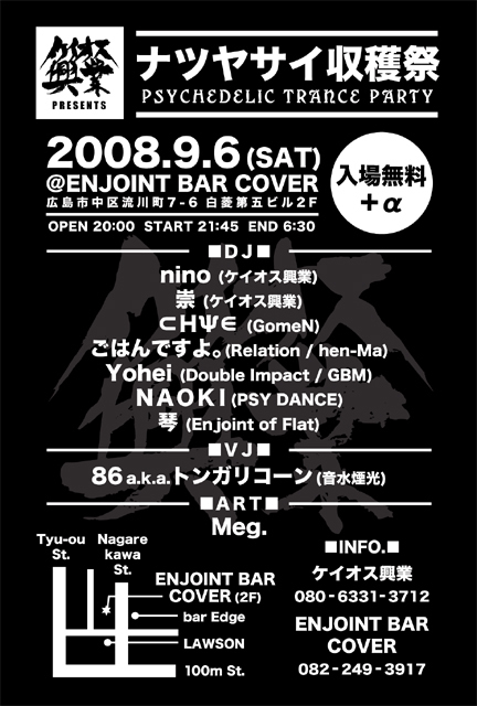 ケイオス興業 PRESENTS 『ナツヤサイ収穫祭』 Psychedelic Trance Party 2008.9.6(SAT) @ENJOINT BAR COVER OPEN 20:00 START 21:45〜END 6:30 入場無料+α 【DJ】 nino (ケイオス興業) 崇 (ケイオス興業) ⊂НΨ∈ (GomeN) ごはんですよ。 (Relation / hen-Ma) Yohei (Double Impact / GBM) NAOKI (PSY DANCE) 琴 (Enjoint of Flat) 【VJ】 86 a.K.a. トンガリコーン (音水煙光) 【ART】 Meg. 【@ENJOINT BAR COVER】 広島市中区流川町7番6号二階(流川通