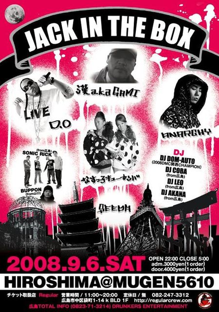 9月6日広島のMUGEN5610でLIVEやっちゃいマス! 豪華なメンバーをお見逃しなく!!! 9/6@MUGEN5610 OPEN 22:00? ??前売¥3000(1Dオーダー) ?当日¥4000(1Dオーダー) ??LIVE ?D.O 漢a.k.aGAMI ?ANARCHY ?SEEDA ?SONIC RICK(広島) ?BUPPN??DANCE ?なすっ子キューカンバ ??DJ ?DOM?AUTO?COBA ?LEO ?AKANA MUGEN5610 info 広島市中区袋町1-14k BLD 1F