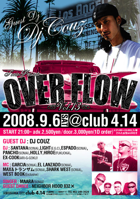☆SONIA PRESENTS☆ 『OVER FLOW VOL.13』 2008.9.6(SAT)広島@4.14 START21:00〜ADV2500円、DOOR3000円(1D ORDER) ※21:00〜22:00に入場した女性は2D付き GUEST DJ DJ COUZ(PLAYGROUND) GUEST DANCE NEIGHBOR HOOD 832X(TOKYO) DJ SANTANA(SONIA) LIGHT(E.G.C) ESPADO(SONIA) PANCHO(SONIA) HOLLY HIROE(FUKUOKA) EX-COOK(ARI-G-GOKU) MC GARCIA(SONIA) EL LANZADO(SONIA) MAX&トランザム(SONIA) WESTBOOK(EXCLUSIVE) SHARK WEST(SONIA) SINGER MAARA(SO