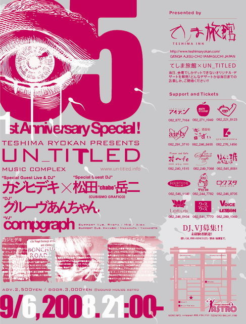 管理人様、告知失礼いたします。 9/6(Sat.) "TESHIMA RYOKAN PRESENTS 「UN_TITLED MUSIC COMPLEX 05 1st.ANNIVERSARY SPECIAL」" at SOUND HOUSE ASTRO (http://blog.livedoor.jp/soundhouse_astro/) 21:00 start 前売り:¥2500 当日:¥3000 (w1d) 【Special Guest LIVE & DJ】 カジヒデキ http://hidekikaji.net/ 【Special Guest DJ】 松田"chabe"岳二 (CUBISMO GRAFICO) http://www.cbsmgrfc.net/ 【DJ】 GROOVE UNCHANT http://www.geocities.jp/dj_grooveunchant 【VJ】 VJ TEAM COMPGRAP