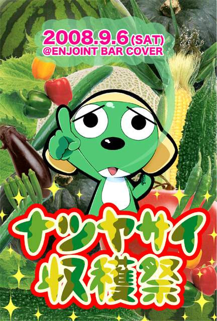 ケイオス興業 PRESENTS 『ナツヤサイ収穫祭』 Psychedelic Trance Party 2008.9.6(SAT) @ENJOINT BAR COVER OPEN 20:00 START 21:45〜END 6:30 入場無料+α 【DJ】 nino (ケイオス興業) 崇 (ケイオス興業) ⊂НΨ∈ (GomeN) ごはんですよ。 (Relation / hen-Ma) Yohei (Double Impact / GBM) NAOKI (PSY DANCE) 琴 (Enjoint of Flat) 【VJ】 86 a.K.a. トンガリコーン (音水煙光) 【ART】 Meg. 【@ENJOINT BAR COVER】 広島市中