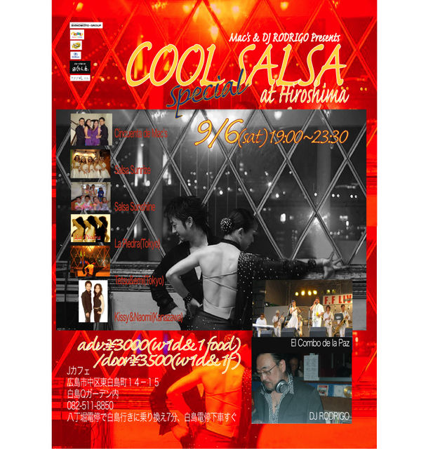 去年に引き続き今年も 毎月第3金曜マンボスでのMac's & DJ Rodrigo共同開催による Cool Salsa広島の特別編をたくさんのゲストを招き 白島J-Cafeでl開催です ゲストは東京から昨年のWSCで上位入賞したテツ&エミ 謎の女性3人組ラ・ピエドラ、 金沢からSHJのペアコンで好成績を残したKissy&Naomiです 地元広島のコンボ・デ・ラ・パスのライブ お馴染みのシンクエンタ・デ・マックス、サルサ・サンライズ、 キッズ・チームのサルサ・サンシャインの華麗なパフォーマンスと 京都DJロドリーゴと地元タカハラのDJタイムを J-Cafeの
