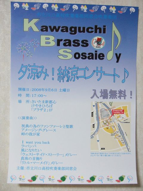 ☆演奏会告知です☆ 夕涼み!納涼コンサート ♪日時 08年9月6日(土) ♪時間 17時スタート ♪出演 川口ブラスソサエティ ♪場所 さいたまスーパーアリーナ 「けやきひろば」 ♪入場料 無料 ♪演奏曲 祝典の為のファンファーレと聖歌 アメージンググレース ラバンバ ウエストサイドストーリーメドレー リトルマーメイド など 吹奏楽はもちろん、スティールドラムの演奏もあります。 是非聴きにき