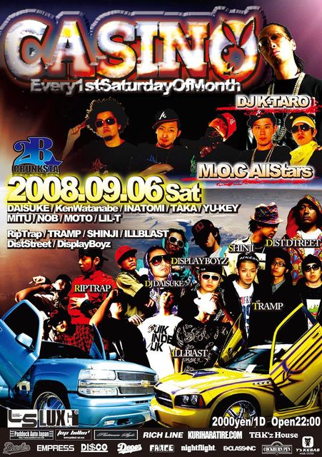 鴻巣CLUB AQUAの第一土曜レギュラーイベントCASINO 毎回大盛況のスペシャルはDJ K-TARO、M.O.C ALL STARS をゲストに迎え、関東のパワーカスタムショップ の協力のもと、車&音楽といったかたちでまたまた 開催です 雑誌の撮影などもありとても楽しいイベント なので是非遊びに来てください☆ OPEN10:00〜 2000/1D