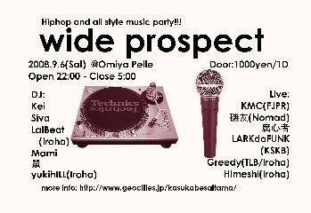 管理人様告知失礼します。 不適切でありましたら削除お願いします。 不定期で第1土曜日に大宮Pelleで開催してきました「伊呂波crew」主催イベント「wide prospect」。 前回は「TAK The Codona」をゲストとして迎え大盛況で終了しました。 今回はUltimateMCBattle東京準予選B優勝者「KMC」や同準予選A準優勝者「磯友」を筆頭に、 埼玉・東京のUnderGroundアーティストでLiveを固め、多彩なジャンルのDJで大宮という街をRockします! また会場である大宮Pelleはドリンクが¥300〜と大変リーズナブルな価格設定をなっており、 とにかく飲