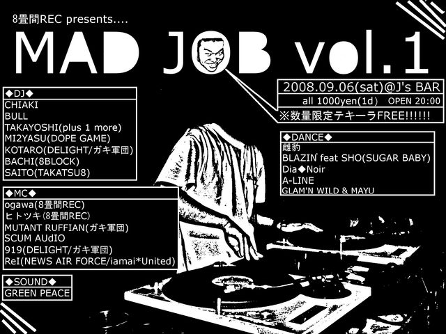 九月から始まる新イベント、MAD JOB! とにかく「楽しい音楽」をコンセプトに、境界線を全力で排除したイベント! 山形県内、様々な地域、様々なイベントを沸かせているダンサー、MC、DJがJ's BARに集結! 一度にこのメンバーが見れるのは山形では「MAD JOB」だけ! 最高の「GOOD MUSIC」をあなたにお届けすることを約束します。 第一回目は9月6日に開催決定! 2008.09.06(sat)@J's BAR 『MAD JOB vol.1』 OPEN 20:00 ALL 1000yen(1D) ☆数量限定テキーラFREE!!!!☆ 〜DJ〜 BULL CHIAKI TAKAYOSHI(plus 1